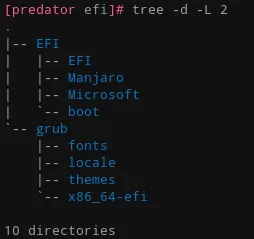 It contains grub (which is the bootloader) and the .efi files for the two operating systems installed — Manjaro Linux and Windows.